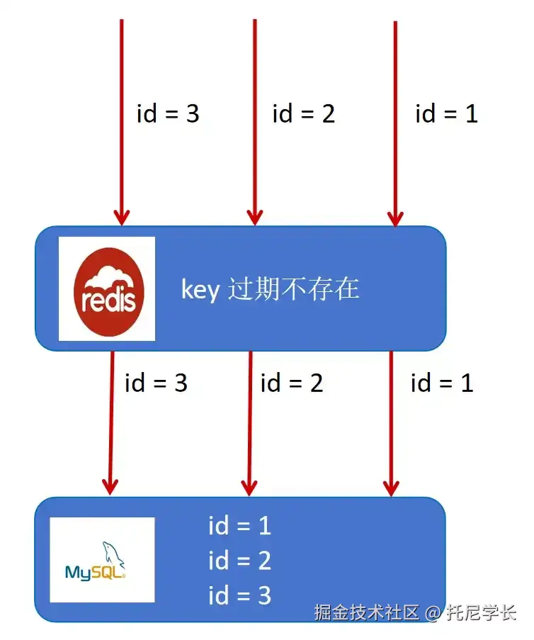 缓存击穿的定义是,用户高并发地对某个已经失效的 Redis key 进行请求,从而导致 MySQL 的压力剧增而系统宕机的情况。