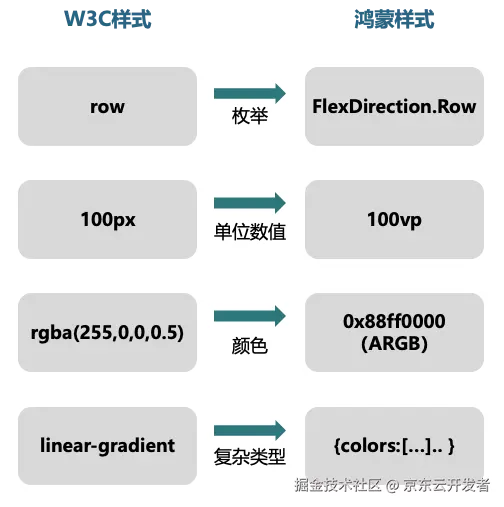 对比可以看出,CSS 样式和鸿蒙样式在单位系统和数据表示方式上存在显著差异。CSS 提供多样化的尺寸和颜色单位,而 ArkUI 的 CAPI 接口采用更统一的表示方式。