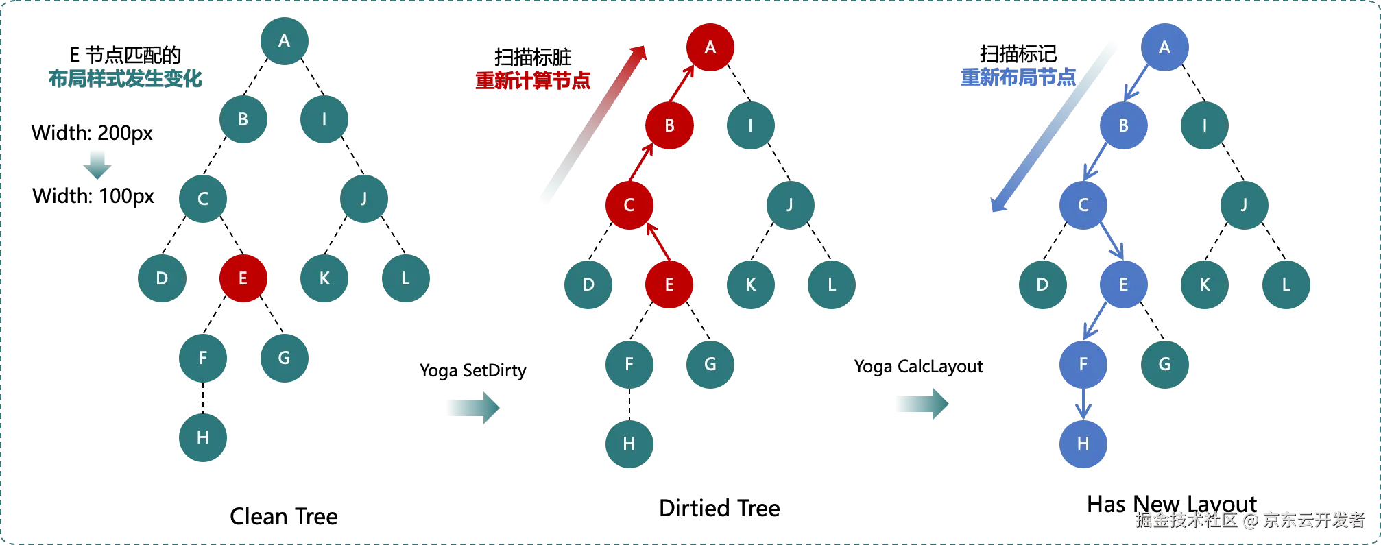 在标记完所有需要更新的节点后,下一帧的样式处理流程就会对这些节点进行处理。首先,系统会调用 Yoga 的 calcYGLayout 函数,让 Yoga 从根节点开始对所有的 Yoga 节点进行测算。在此过程中,布局信息发生改变的 Yoga 节点会被打上 has_new_layout 的标记,节点上的信息也会被更新。
