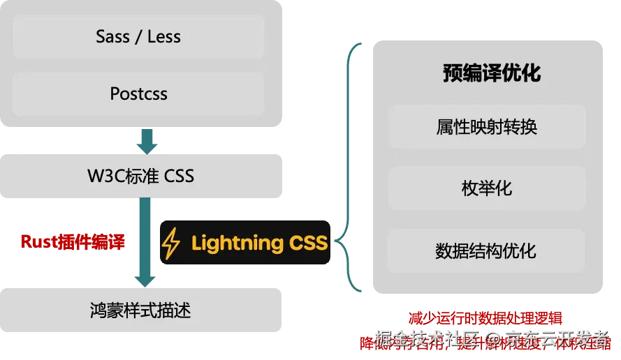 一个页面通常会包含非常多的样式规则,如果所有的单位转换都放在运行时候完成,必定会造成明显的性能问题。因此,我们选择提前完成部分转换。HTML 节点的样式主要来源于 CSS 和 Style 属性。CSS 样式通常是静态的,可以在编译阶段进行转换。为此,我们基于 lightningCSS 开发了一个 Rust 插件。该插件通过遍历项目 CSS 的抽象语法树(AST),将其转换为 ArkUI 的 CAPI 接口可直接使用的数据结构。
