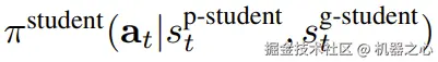 对于从 oracle 教师 π^oracle 中蒸馏得到的学生策略 π^student,本体感受定义为其中 q 是关节位置,