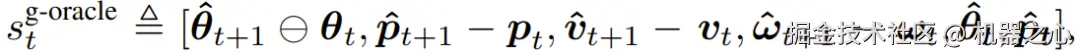他们训练了一个 oracle 运动模拟器 其中 p_t 是人形机器人刚体位置 、θ_t 是方向、p_t 是线速度、 ω_t 是角速度、a_{t−1} 是前一个动作。本体感觉定义为