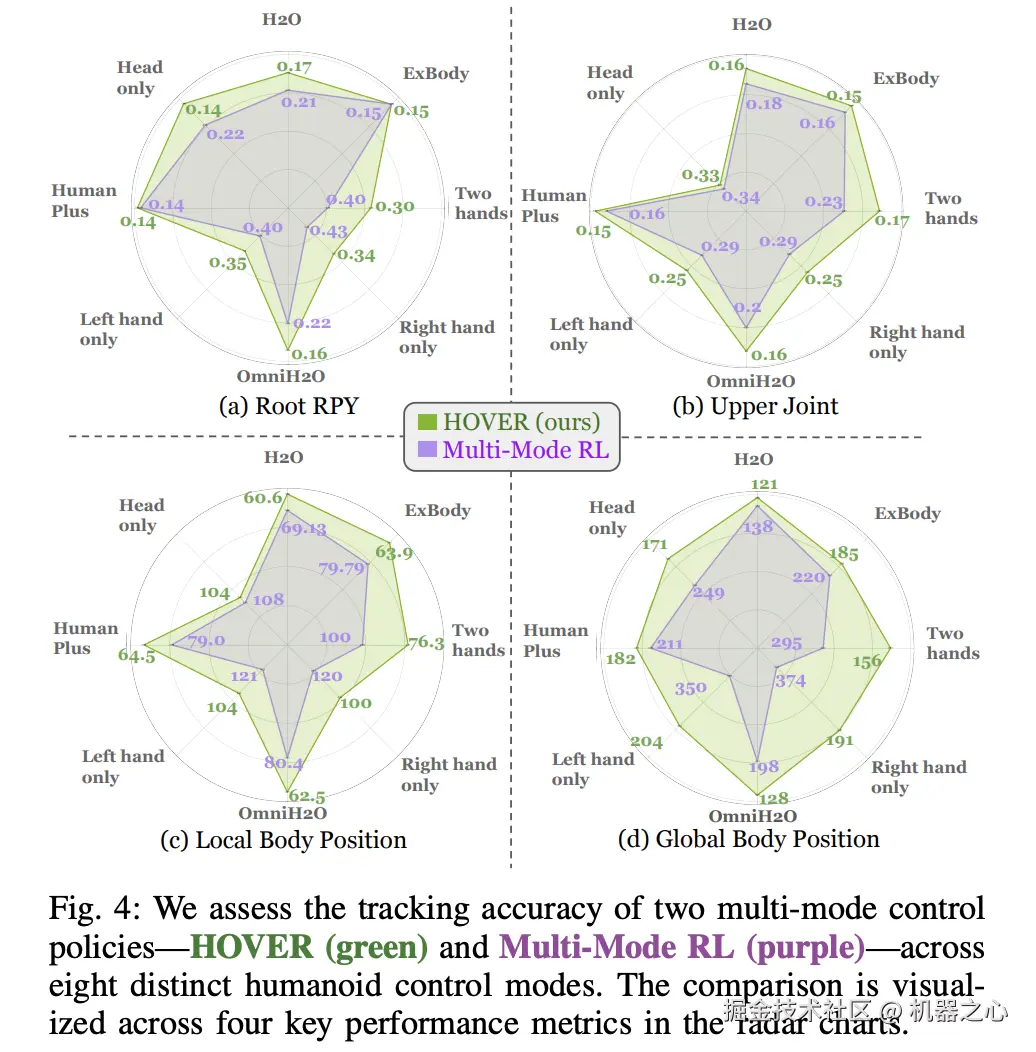 如表 III 和图 3 所示,HOVER 展现出了优越的泛化能力。在每一种指令模式中,HOVER 在至少 7 个指标上超越了之前的专家控制器(表 III 中用粗体值突出显示)。同时,这也意味着即使只关注单一控制模式,从专家策略中提取的策略也比通过强化学习训练出的专家更强。