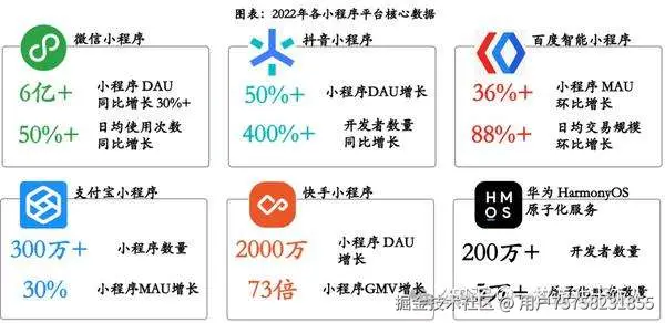 2022年小程序平台数据亮眼。据阿拉丁,2022年微信小程序、抖音小程序、快手小程序DAU分别同比增长30%、50%、30%;百度小程序和支付宝小程序MAU分别同比增加36%、30%;华为HarmonyOS原子化服务数量超过5万。