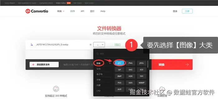 如果你的文件体积较小,设备有限的话,可以选择访问Convertio网站进行转换。只需上传要转换的webp图片,在下拉菜单中选择转换目标格式为 【jpg】 ,最后点击 【转换】 按钮,最后,转换完成后,下载转换好的jpg图片。