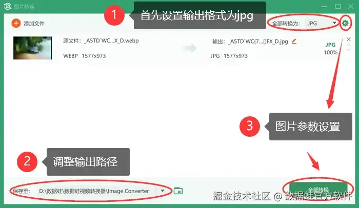 步骤3: 在图片转换界面,您可以看到已添加的图片列表。在图片列表下方,找到并选择 【输出格式】 为 【JPG】 。如果需要,您还可以调整其他输出设置,如输出路径、图片质量等。
