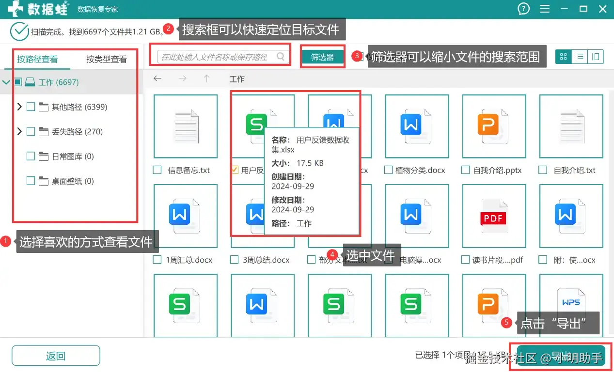 第2步:等软件扫描完毕后,在左侧可以选择用户偏好的分类方式查看目标文件,也可以选择借助 “搜索框” 、 “筛选器” 等快速定位到目标文件;找到后点击文件表示选中,点击“导出” 。