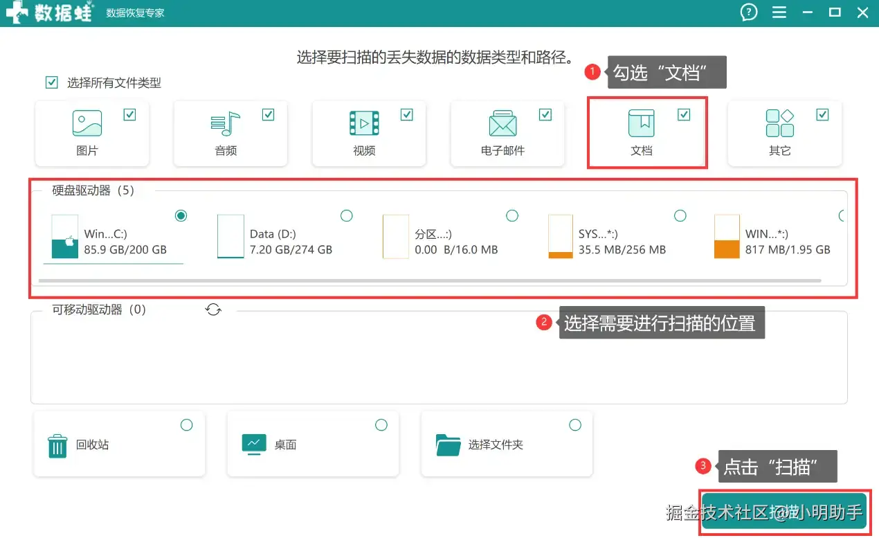 第1步:打开软件后进入主页面,勾选 “文档” 作为扫描类型,再勾选上需要扫描的位置,点击 “扫描” ;
