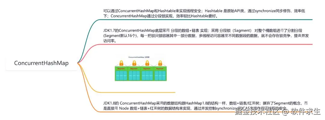 ConcurrentHashMap的核心思想是分段锁,这使得它在性能上要远优于Hashtable。简单来说,ConcurrentHashMap将数据划分成多个段(Segment),每个Segment对应一个锁。不同线程访问不同Segment的数据时,可以同时进行而不互相阻塞,从而提高了并发性能。