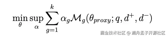 面向大模型稠密检索(LLM-DR)的分布鲁棒优化 (DRO) 问题,旨在找到一组最优的 α,以最大化模型在下游任务上的性能。