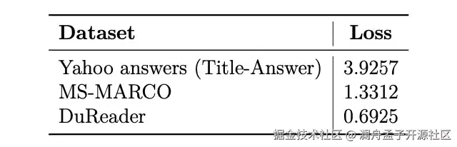 Table 1: Yahoo answers (Title-Answer),MS-MARCO 和 DuReader 数据集损失大小对比。LLM-DR 模型以 Qwen1.5-0.5B 为基座,均匀采样训练了 1k steps。