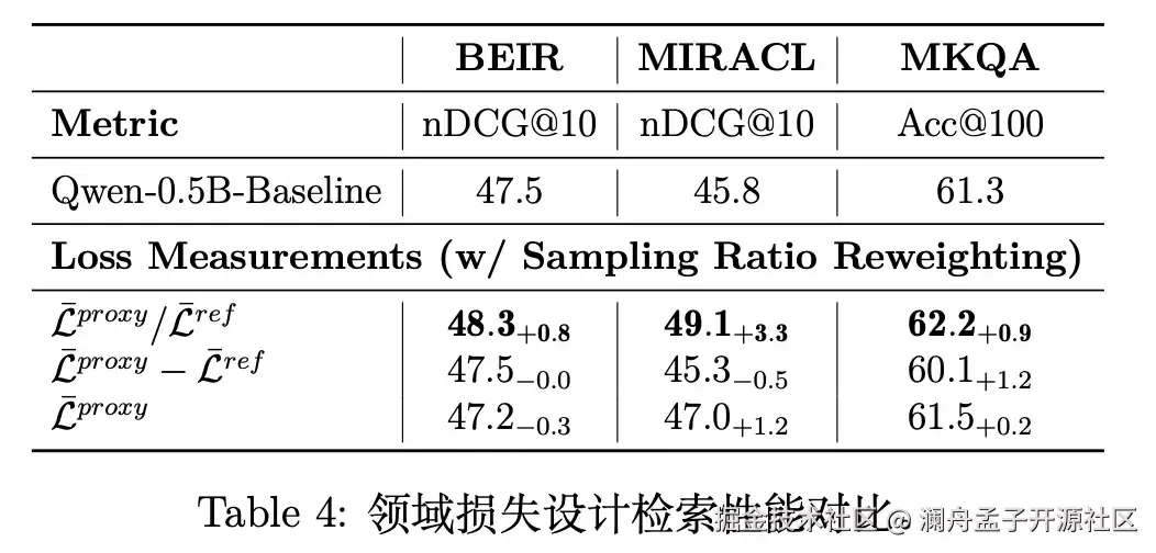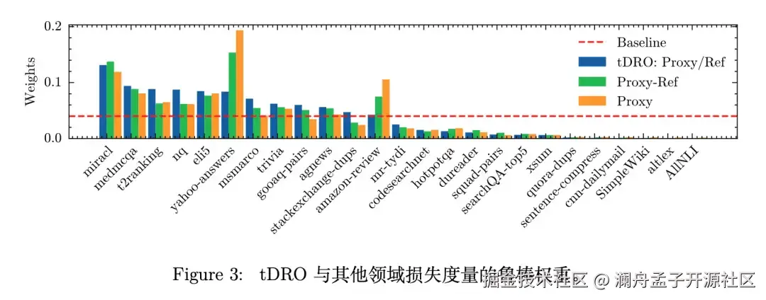 分布鲁棒优化(GroupDRO)等算法在鲁棒优化中,动态对比不同领域的损失(Loss)大小,损失越高,权重越大。然而,这种方法并不适用于大模型稠密检索(LLM-DR)中的异质数据。以下表中三个数据集的损失大小为例,在 Qwen1.5-0.5B模型上,Yahoo answers 的损失是 MS-MARCO 的 3 倍,DuReader 的 5 倍。如果直接以领域损失作为权重分配的依据,那么 Yahoo answers 将始终会得到更高的权重,这种优化方式显然是不合理的。