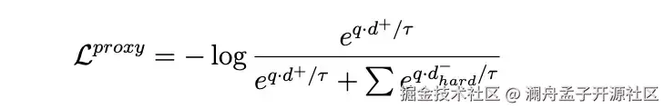 在对比学习的 step t 中,代理模型以 1/k 的比例采样所有数据,并为每一条数据生成一组 [查询 q,正例文档 d+,困难负例文档 d−hard]。代理模型使用 InfoNCE loss 作为损失函数,其计算过程如下: