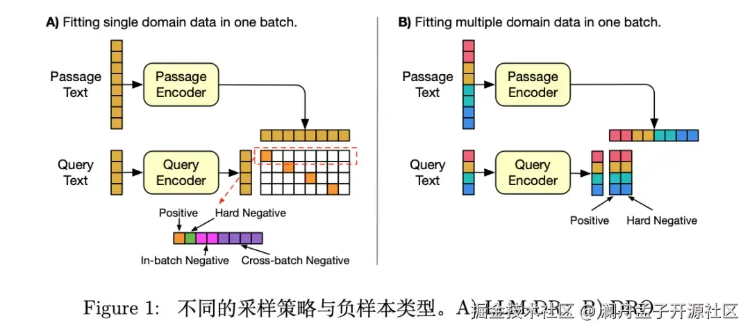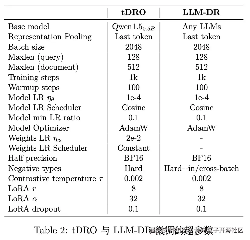 LLM-DR 微调同样使用了 InfoNCE Loss,并结合了困难负样本(Hard Negatives)、批次内负样本(In-batch negatives)、跨批次负样本(Cross-batch negatives)三种负样本进行训练。需要注意的是,LLM-DR 在同一个批次(Batch)只采样一个来源的负样本,以保证负样本的质量。