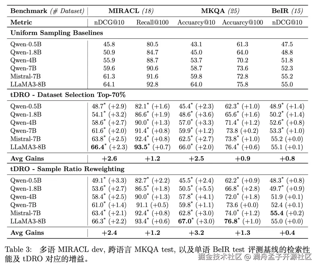 进一步地,在 Dataset Selection Top-70% 实验组中,我们尝试将它们从训练中全部去掉,所有的 LLM-DR 的多语言、跨语 言、单语言检索性能均得到了提升,这证明了 tDRO 方法的有效性。