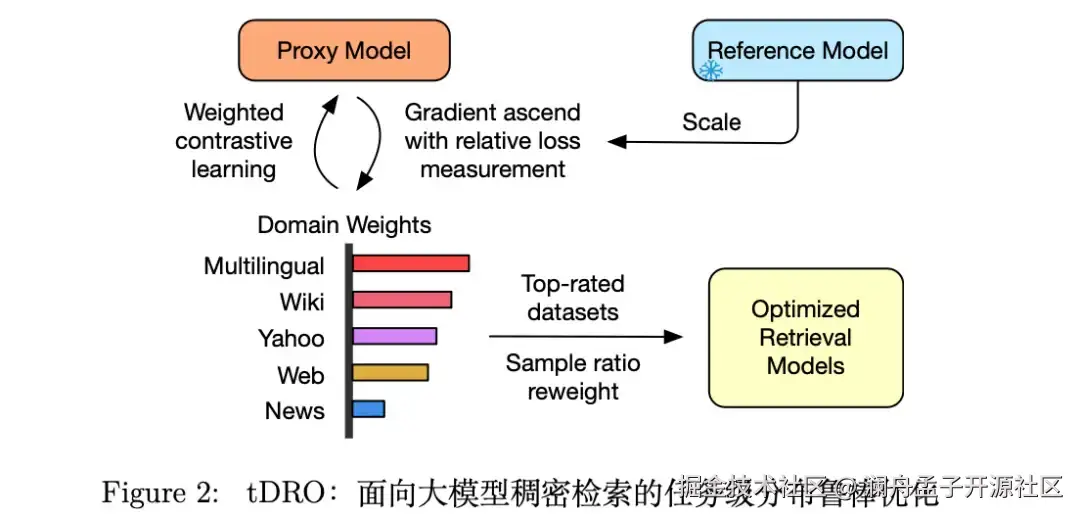为了解决 LLM-DR 和 DRO 之间的采样冲突,tDRO算法将分布鲁棒优化(DRO)与稠密检索微调(LLM-DR Fine-tuning)两个过程进行分离。首先,利用代理模型 (Proxy Model)只使用困难负样本(Hard Negatives, HN)来学习鲁棒的数据分布。随后,将数据分布迁移到 LLM-DR 中,结合三种负样本(困难负样本、批次内负样本、跨批次负样本)进行完整训练。
