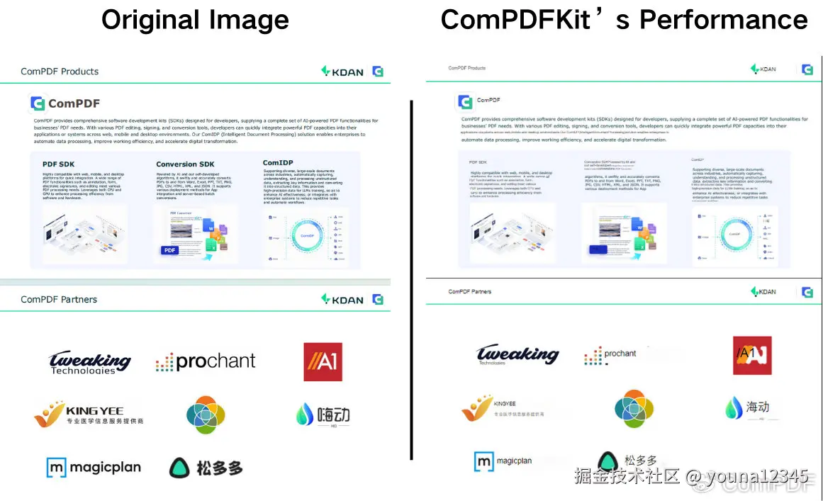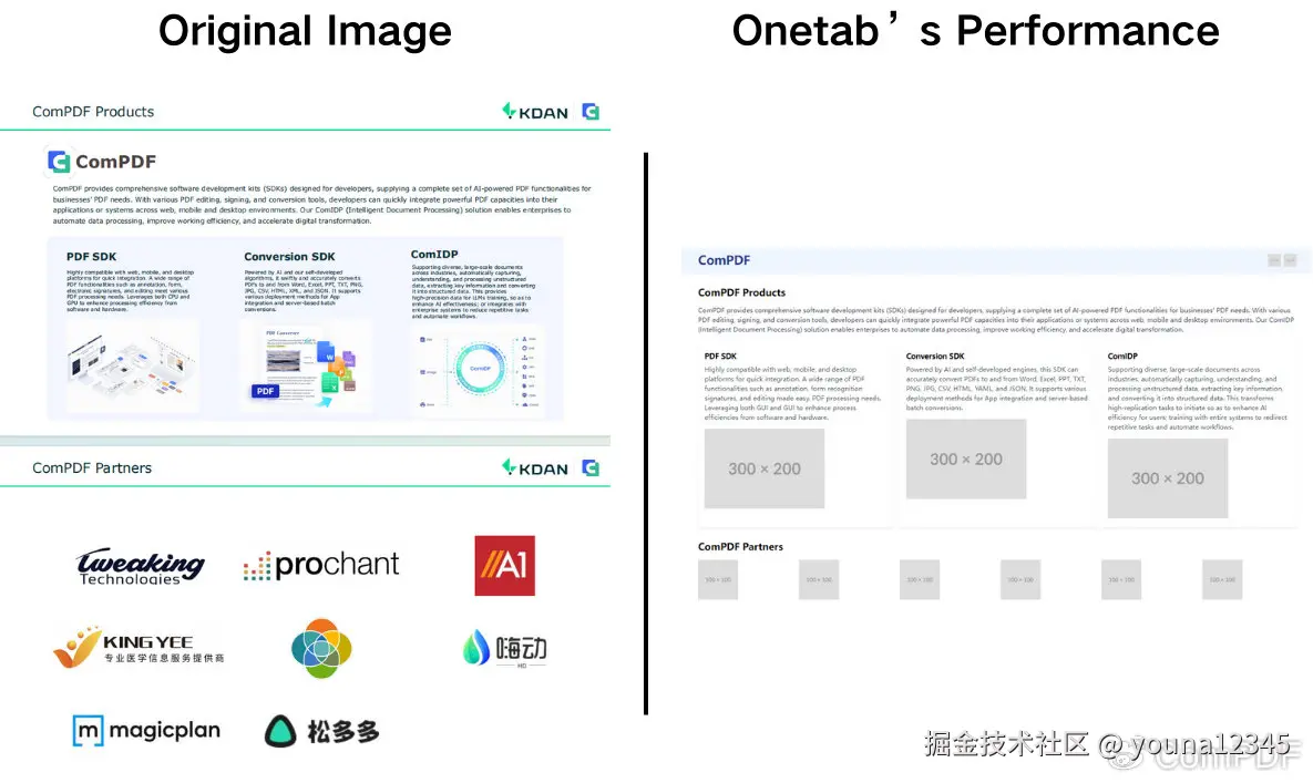 在 HTML 结果页面中,它能够保留原始设计中的文本、图片、文本框、图片框以及线条和布局等设计元素。但是,文本的一些字体样式和图片的大小与原始设计相比略有差异。总体而言,与其他品牌相比,ComPDFKit将图片转换为 HTML的效果是最好的。