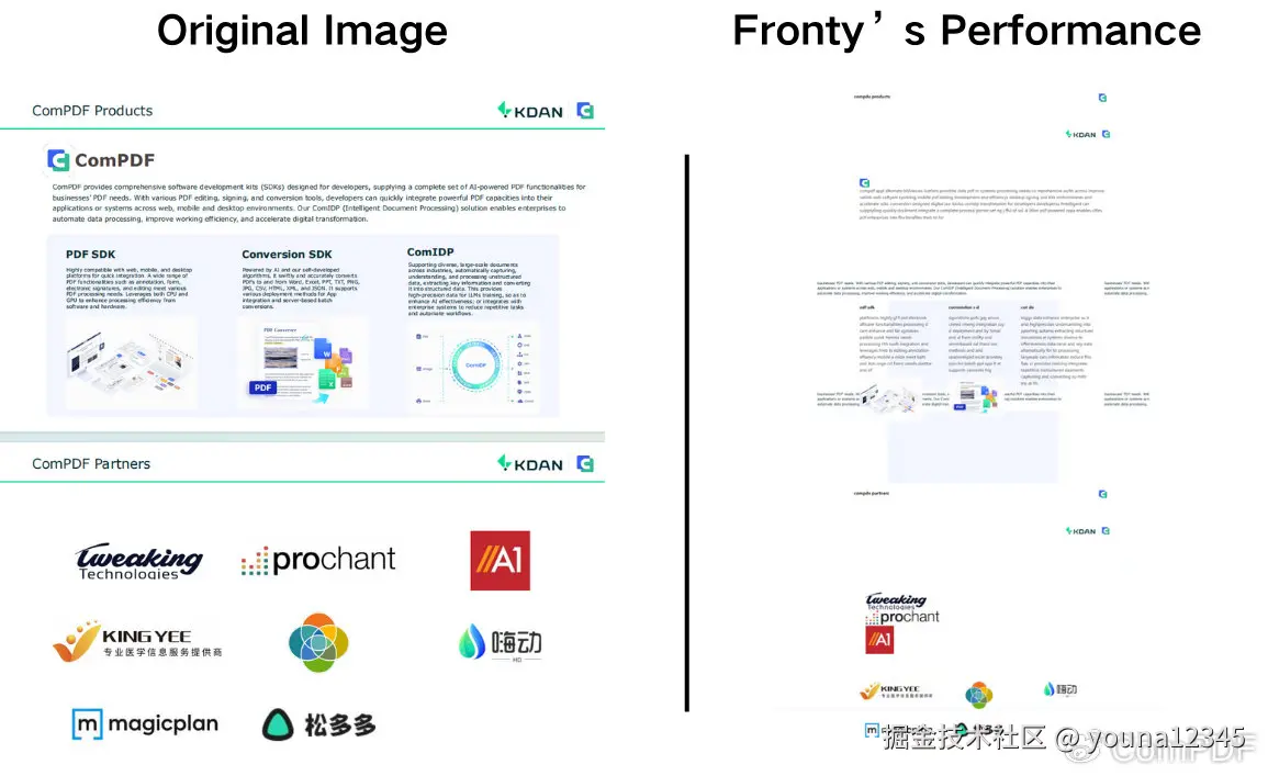 该品牌在识别文本和图像方面表现出了极高的准确率,但在布局恢复方面仍有改进空间,因为原始设计中的一些图像不必要地经过 OCR。