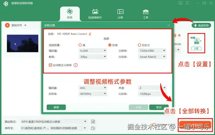 步骤3:在mov转换mp4格式列表中,点击【设置】调整视频格式参数,保证视频质量,最后点击【全部转换】即可。