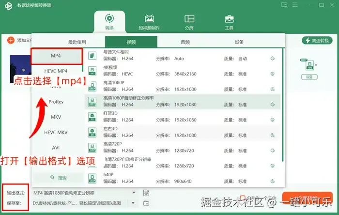 步骤2:打开【输出格式】选项,在弹出来的格式选择列表中,点击选择【mp4】视频格式。