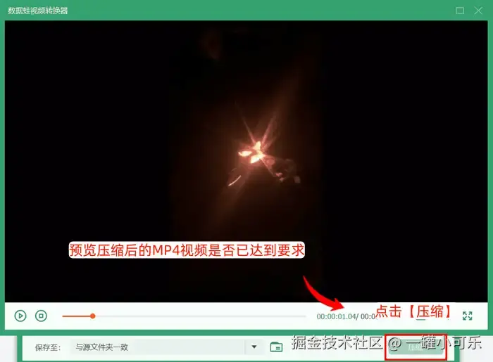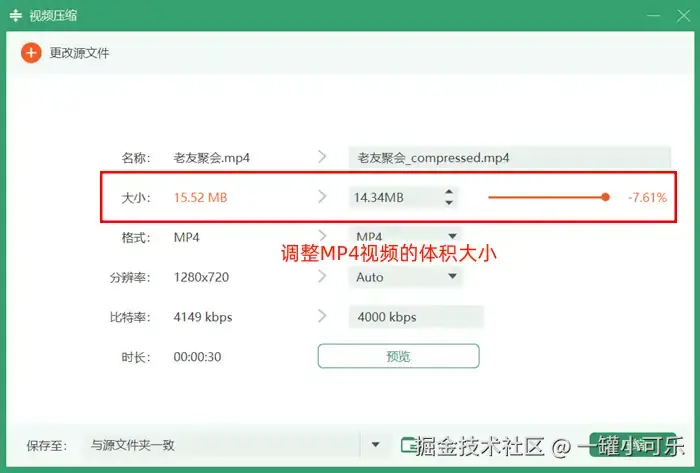 步骤3:调整好体积参数后,点击【预览】观看压缩后的MP4视频是否已达到要求,确认后点击【压缩】。