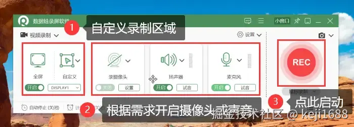 步骤2:在常用的 【视频录制】 模式中,我们可以自定义录制区域、调整摄像头和录制声音。设置完成后点击 【REC】 即可打开录屏。