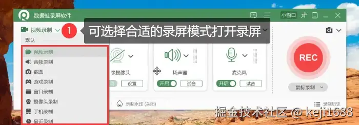 步骤1:在电脑上启动录屏软件,在首页的左上角上根据录制的需求选择合适的录屏模式。