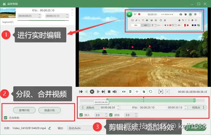 步骤3:在录制中我们可以对视频进行实时的编辑,录制完成后可以进入 【高级剪辑】 页面对视频进行分段、剪辑、增加特效等操作。
