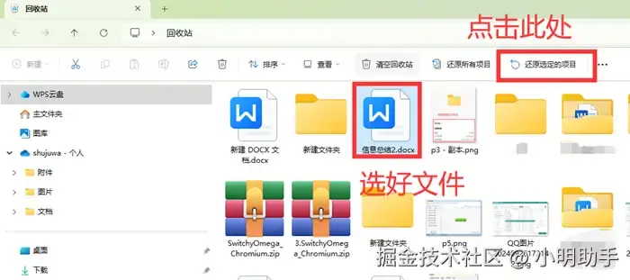 打开电脑桌面上的【回收站】图标,在里面找自己需要恢复的文件,点击上方的【恢复所选的项目】。
