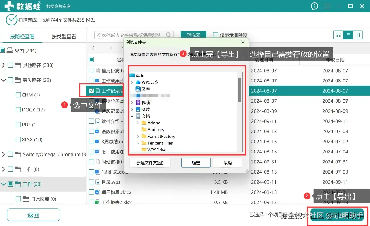 步骤3: 选择好自己需要恢复的文件,点击【导出】,最后在弹窗选好自己存放文件的位置。