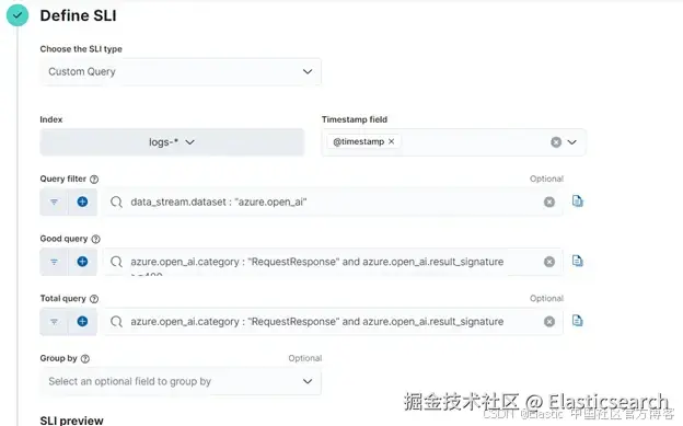 同样地,要创建一个用于监控 Azure OpenAI 调用错误率的 SLO,首先使用自定义查询 SLI 定义,将符合条件的事件定义为所有响应中状态码在 400 或以上的结果。然后,通过设定一个合适的 SLO 目标,例如 99%,开始在 7 天、30 天或 90 天内监控 Azure OpenAI 的错误率 SLO,以跟踪性能下降并在问题普遍化之前采取措施。