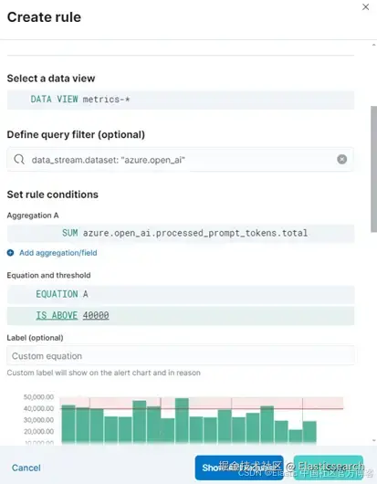 例如,要创建警报以监控 token 使用情况,请从 Azure OpenAI 数据流上的自定义阈值规则开始,并设置聚合条件以跟踪和报告超过特定阈值的 token 使用违规行为。