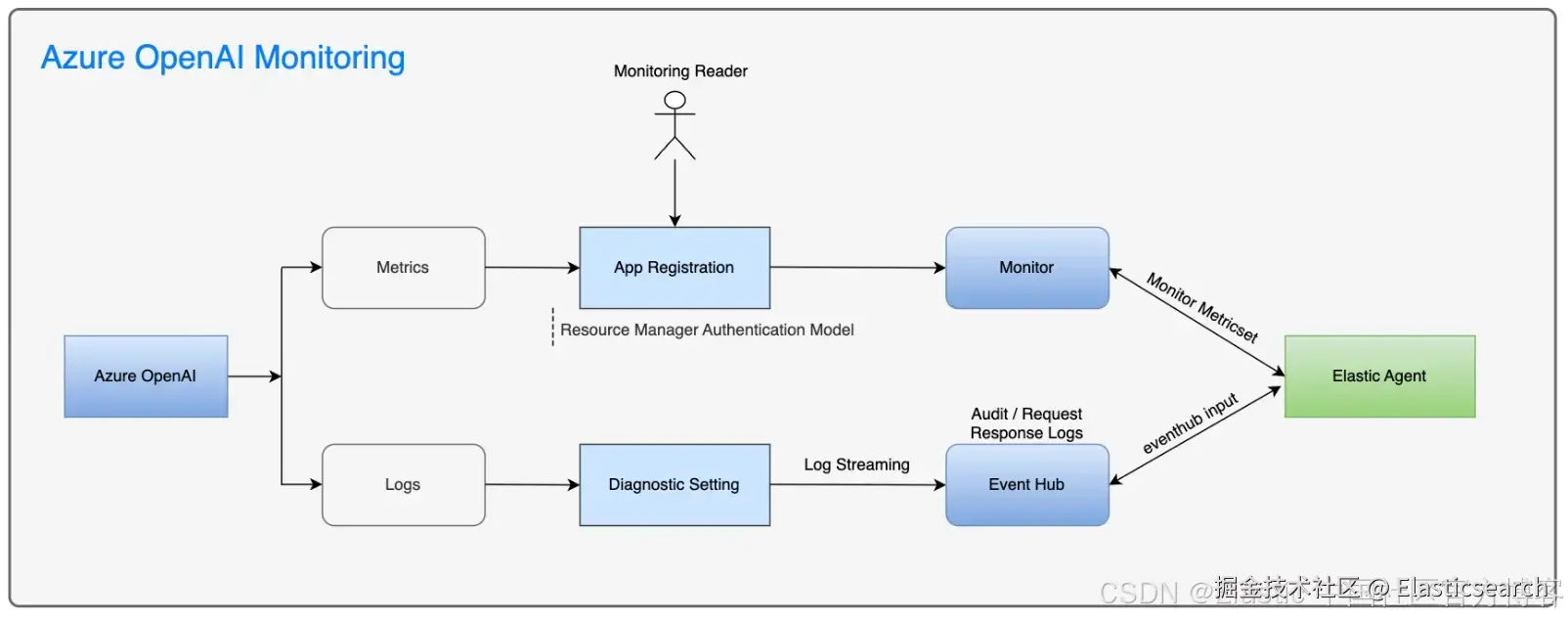 Azure OpenAI 集成利用 Elastic Agent 的 Azure 集成功能来收集日志(使用 Azure EventHub)和指标(使用 Azure Monitor),以深入了解 Azure OpenAI 服务的使用情况。