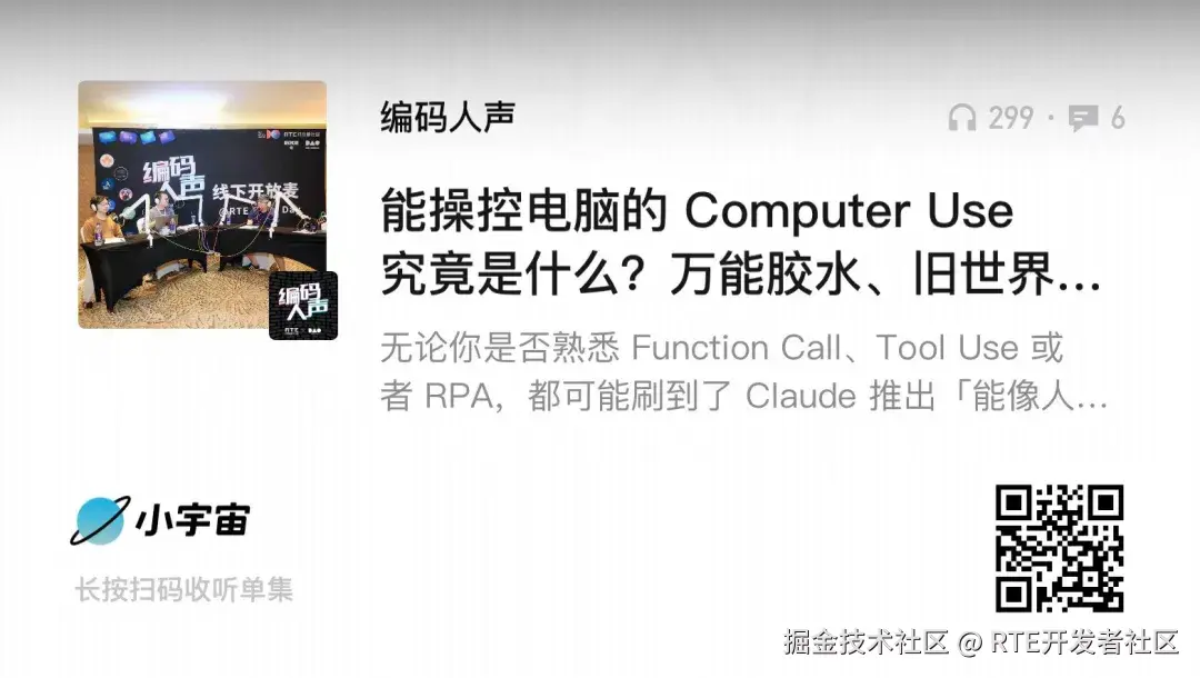 三个开发者在 Computer Use 发布前,就长期从事 AI 自动化设计或端侧 AI 能力的探索。他们如何看待这一次 Claude 的新品发布?Computer Use 究竟是什么?又该如何「use」?期待这期节目对你有所启发。 本期播客录制于 RTE 2024 大会期间的「《编码人声》线下开放麦」,这是开放麦特辑的第一期。