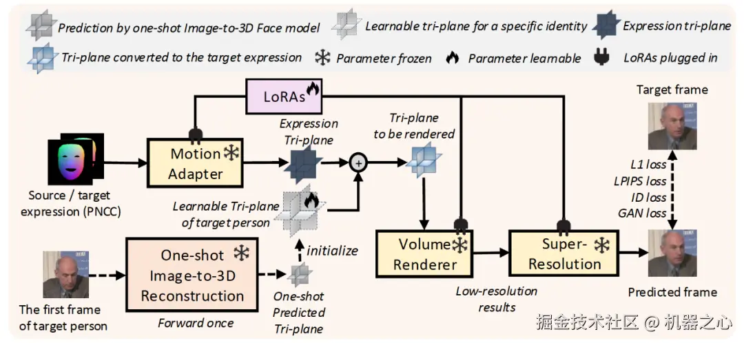 具体来说,研究者发现现有的 3D 数字人通用模型通常会将 3D 人脸的静态细节储存在一个 3D 人脸表征(tri-plane)中作为模型的输入,而 3D 人脸的动态细节,则通过模型内部的参数进行储存。因此,MimicTalk 在个性化数字人渲染器的训练过程中,不仅会更新储存静态细节的 3D 人脸表征,还通过 LoRA 技术对通用模型的参数进行了可拆卸的高效微调。