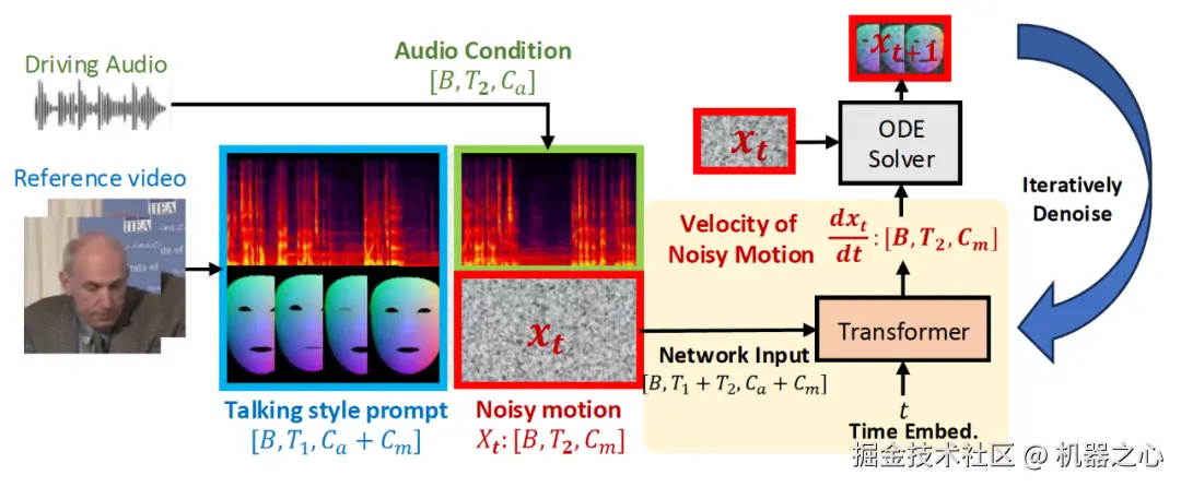 在实现图像上与真人的高度相似后,下一个问题是如何生成与真人说话风格相似的面部动作。传统方法通常会额外训练一个说话风格编码器,但是由于模型内部信息瓶颈的存在通常会性能损失。与之相比,受启发大语言模型、语音合成等领域的启发,MimicTalk 首次提出从上下文中学习目标人说话风格的训练范式。在训练阶段,Flow Matching 模型通过语音轨道和部分未被遮挡的人脸动作轨道的信息,对被遮挡的人脸动作进行去噪。在推理阶段,给定任意音频 - 视频对作为说话人风格提示,模型都能生成模仿该说话风格的人脸动作。