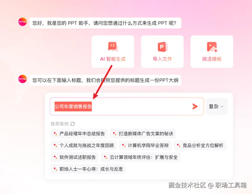 最值得一提的莫过于AI智能生成PPT功能,这对突发需要制作PPT或刚有一个主题想法但不知如何展开时来说,就派上用场了。你只需要输入PPT主题或关键词,在生成输入框中输入比如“公司年度销售报告”或者“人工智能在医疗领域的应用前景”,然后点击生成按钮,博思AIPPT的AI系统就会迅速启动。