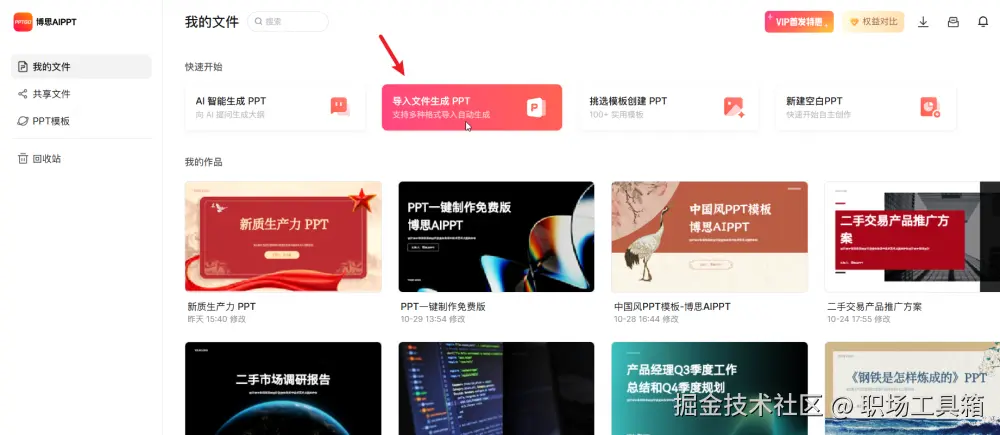 打开博思AIPPT的工作台PPTGO,清晰直观的用户界面会映入眼帘,点击下方的“导入文件生成PPT”选项。