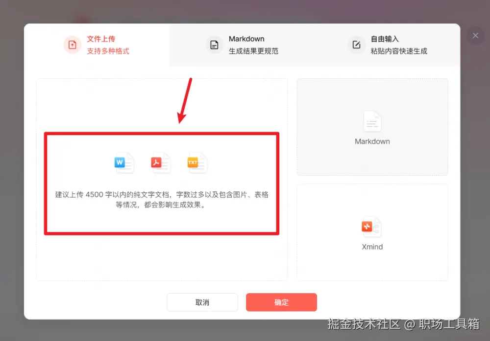 点击选项后会弹出下图的界面,这里列出了博思AIPPT支持导入的所有文件,包括Word、PDF、TXT、Markdown、思维导图Xmind文件,点击左侧的PDF图标,上传本地待转换的PDF文件。