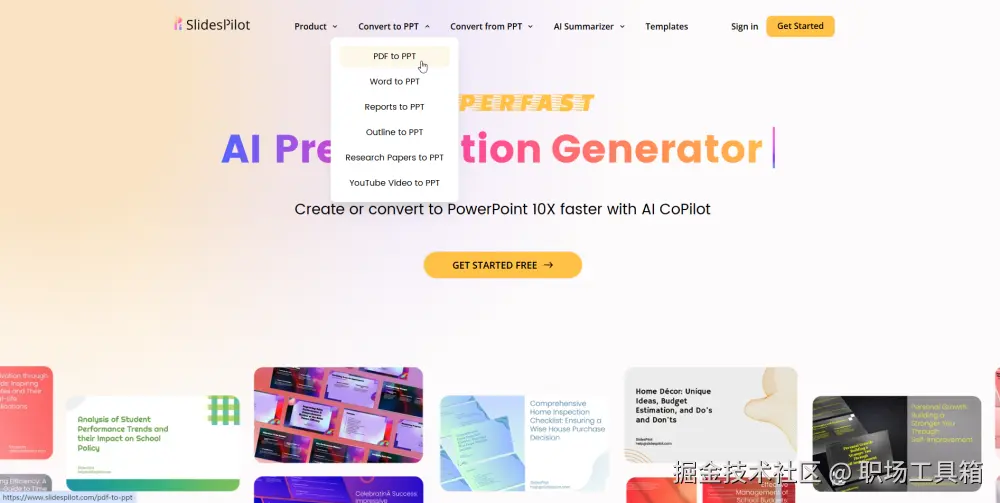 Slidespilot 是基于AI技术的在线文档处理工具,在PDF转PPT方面有独特优势。它能够将 PDF、Word、报告、大纲、研究论文等转换为PPT。虽然目前暂不支持中文输出,但它具有多种其他优势。例如,操作简单便捷,用户只需选择对应的工具,即可将文档内容生成PPT。其转换过程快速高效,能够满足用户在紧急情况下的需求。