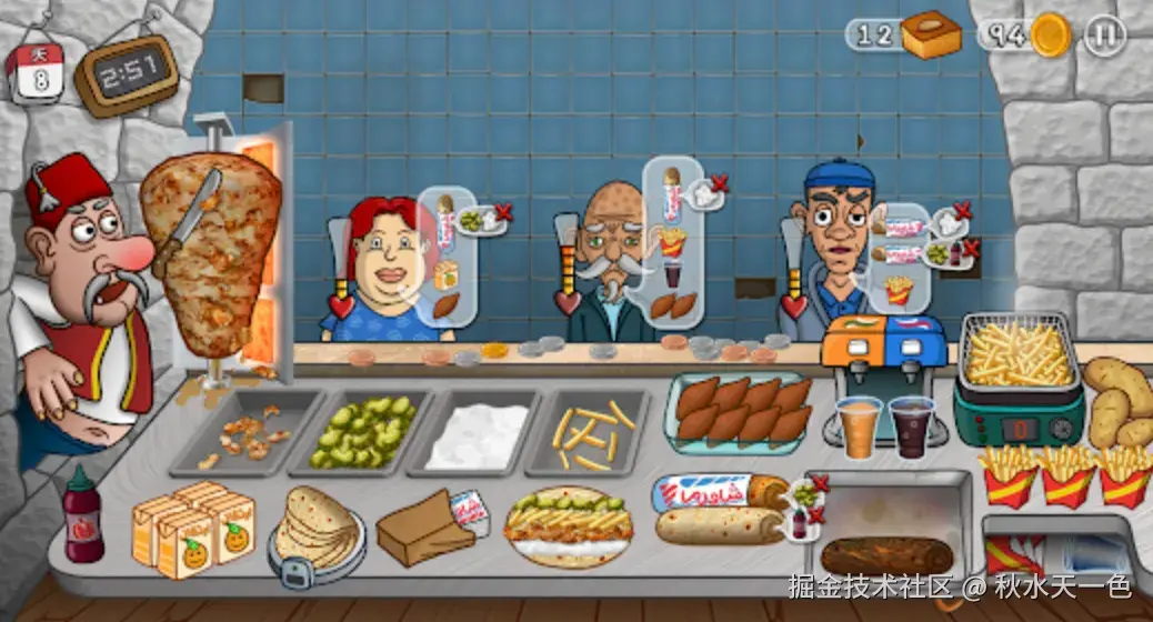 拆解【沙威玛传奇】,我们可以总结出这几个关键词,如餐厅经营、沙威玛专卖店、固定店面、时间管理、有通关条件。根据这些描述,大家应该都能够联想到好几个餐厅爆款游戏,比如专门卖披萨的【可口的披萨,美味的披萨】,有海绵宝宝IP加成的【海绵宝宝大闹蟹堡王】,以及专在飞机上送餐的【飞机大厨】。