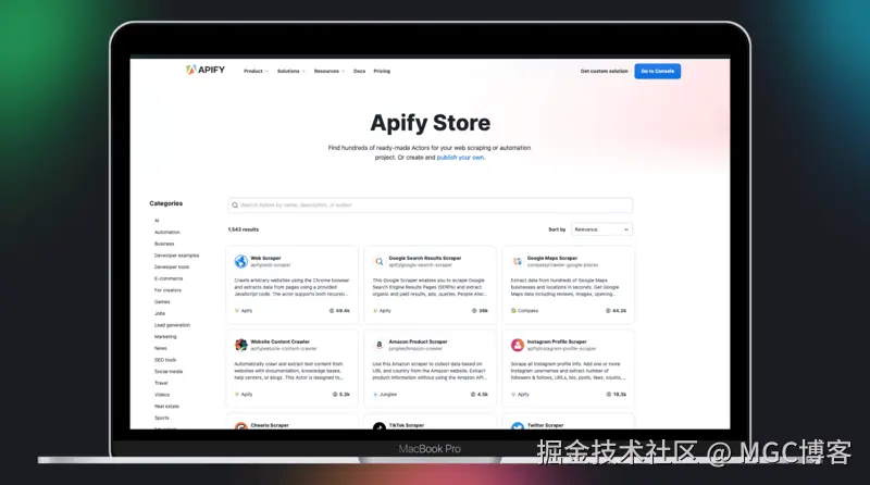 Apify 还托管由其他开发人员创建的现成数据提取和自动化工具(Actor)库,您可以根据您的用例进行自定义。这意味着您不必从头开始构建一切。