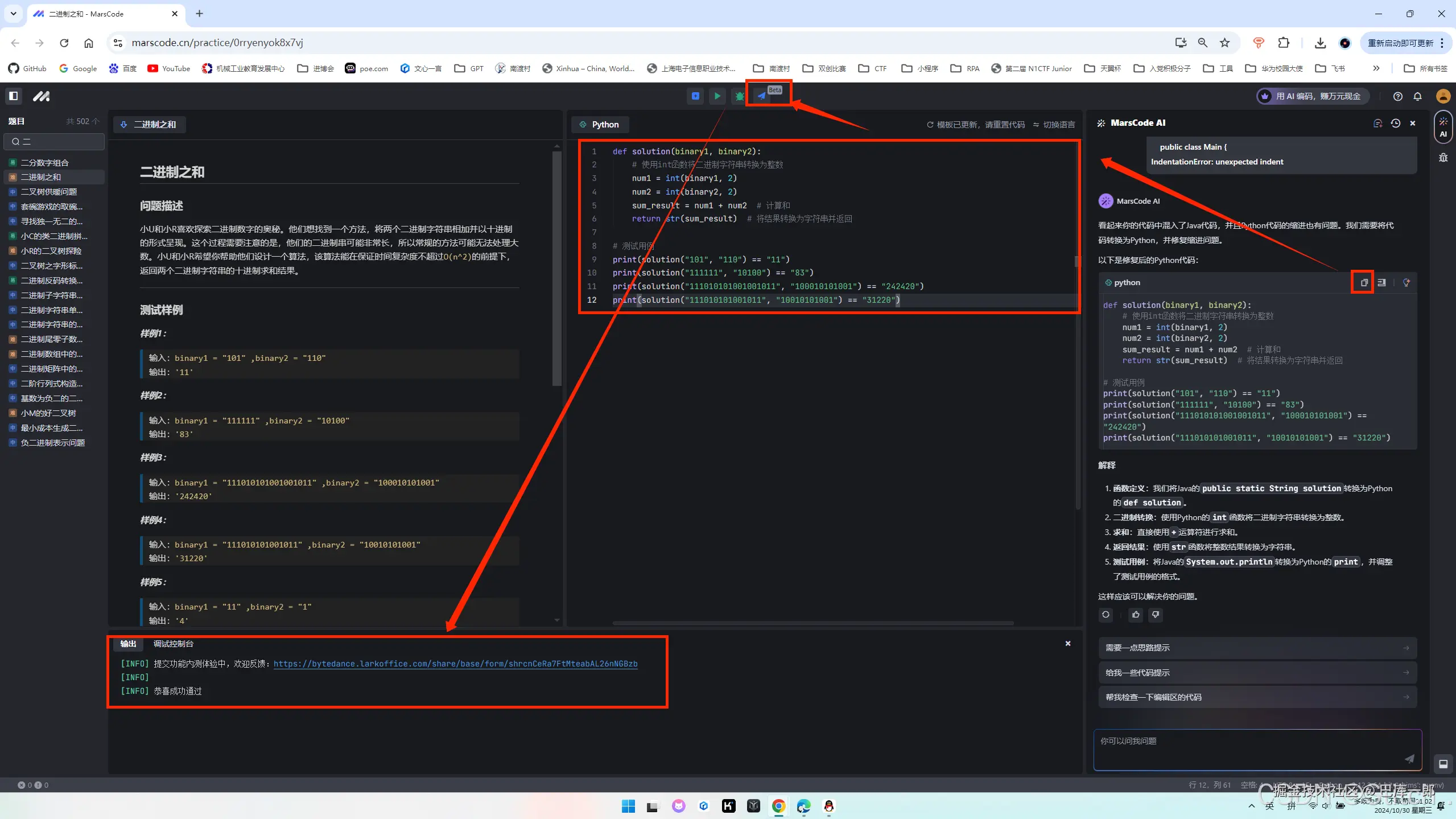 - 结果处理:reverse(result.begin(), result.end());:由于是从字符串末尾开始构建结果,因此最后需要反转字符串。long long decimalSum = stoll(result, 0, 2);:将二进制字符串转换为十进制长整数。这一步实际上是多余的,因为题目要求返回的是十进制字符串,而不是长整数。return to_string(decimalSum);:将十进制长整数转换回字符串并返回。由于前面的 stoll 转换是多余的,这一步也可以优化为直接返回 result 字符串(在反转之后)。