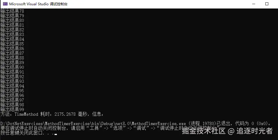 Console.WriteLine($"方法:{methodBase.Name} 耗时:{elapsed.TotalMilliseconds} 毫秒,信息:{message}");