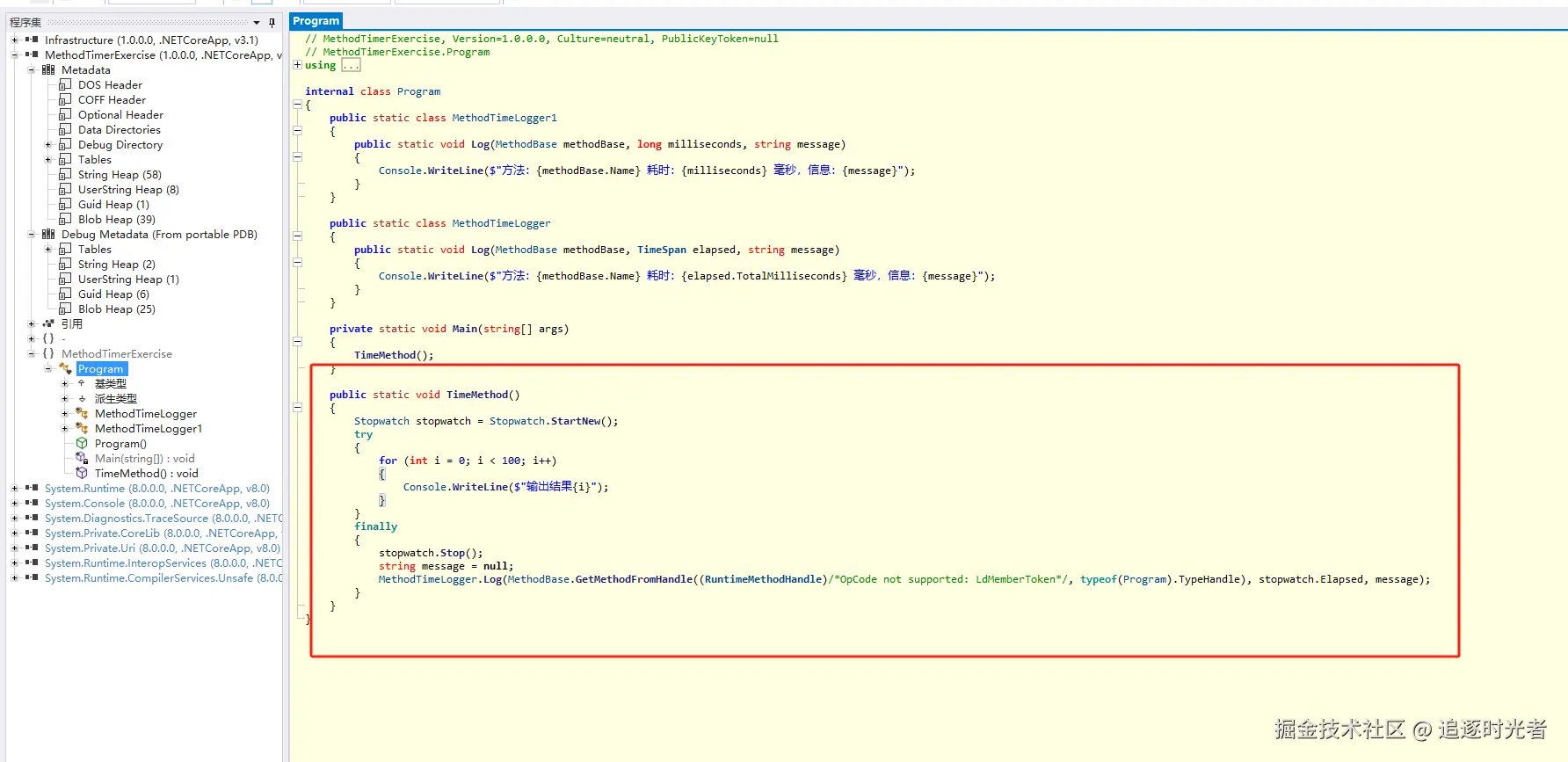 通过在方法上添加 Time 属性,MethodTimer 会在编译时自动向 TimeMethod 注入计时代码。