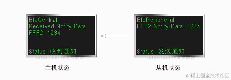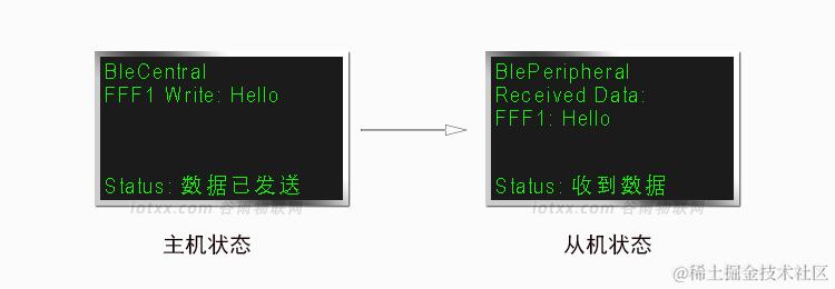 主机通过特征值0xFFF1,主动向从机发送自定义数据,当数据成功发送后,主机状态变为:数据已发送。从机将收到主机发来的数据,从机状态变为收到数据。