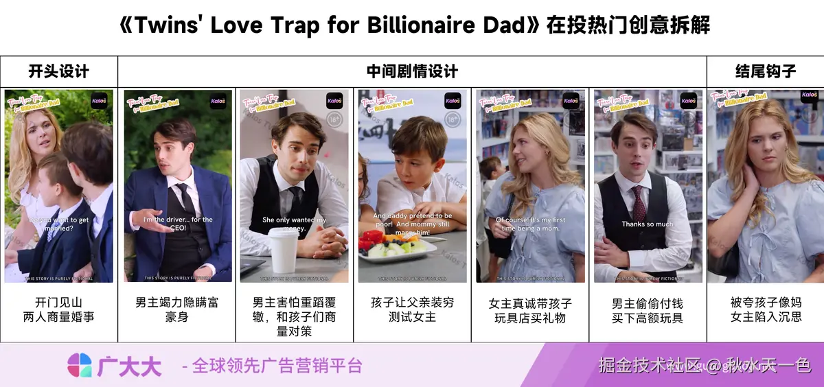 热门创意方面,《Twins' Love Trap for Billionaire Dad》选择更多展现自己剧情的与众不同,将萌宝选妈的戏码放在视频的开头,像下面这条素材便是一开始就提到了男女主的婚事,中间萌宝为父亲测试母亲出谋划策的演绎也让孩子们的古灵精怪完美崭露,目前该素材的展现估值已经达到了13.4W,下图为素材剧情简要拆解。