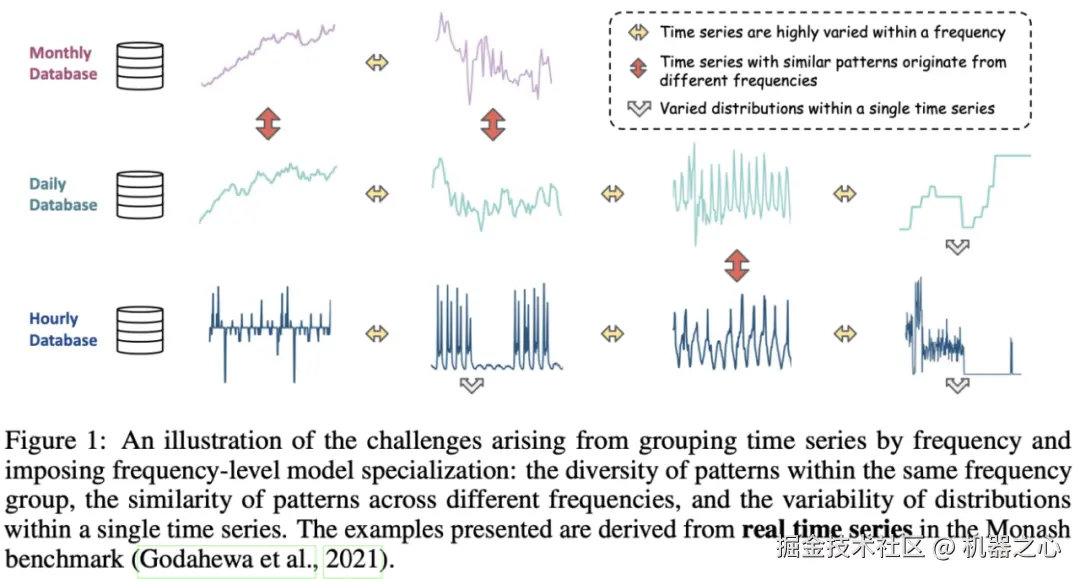 作者认为,这种人为强加的频率级专业化缺乏普适性,并引入了一些局限性。(1)频率并不总是一个可靠的指标,无法有效地捕捉时序数据的真实结构。如下图所示,具有不同频率的时间序列可以表现出相似的模式,而具有相同频率的时间序列可能显示出多样且不相关的模式。这种人为强加的频率和模式之间的不匹配削弱了模型专业化的有效性,从而导致性能下降。(2)现实世界的时间序列本质上是非平稳的,即使在单个时间序列的短窗口内也会显示出不同的分布。显然,频率级专业化的粒度无法捕捉这种程度的多样性,这凸显了对更细粒度的建模方法的需求。