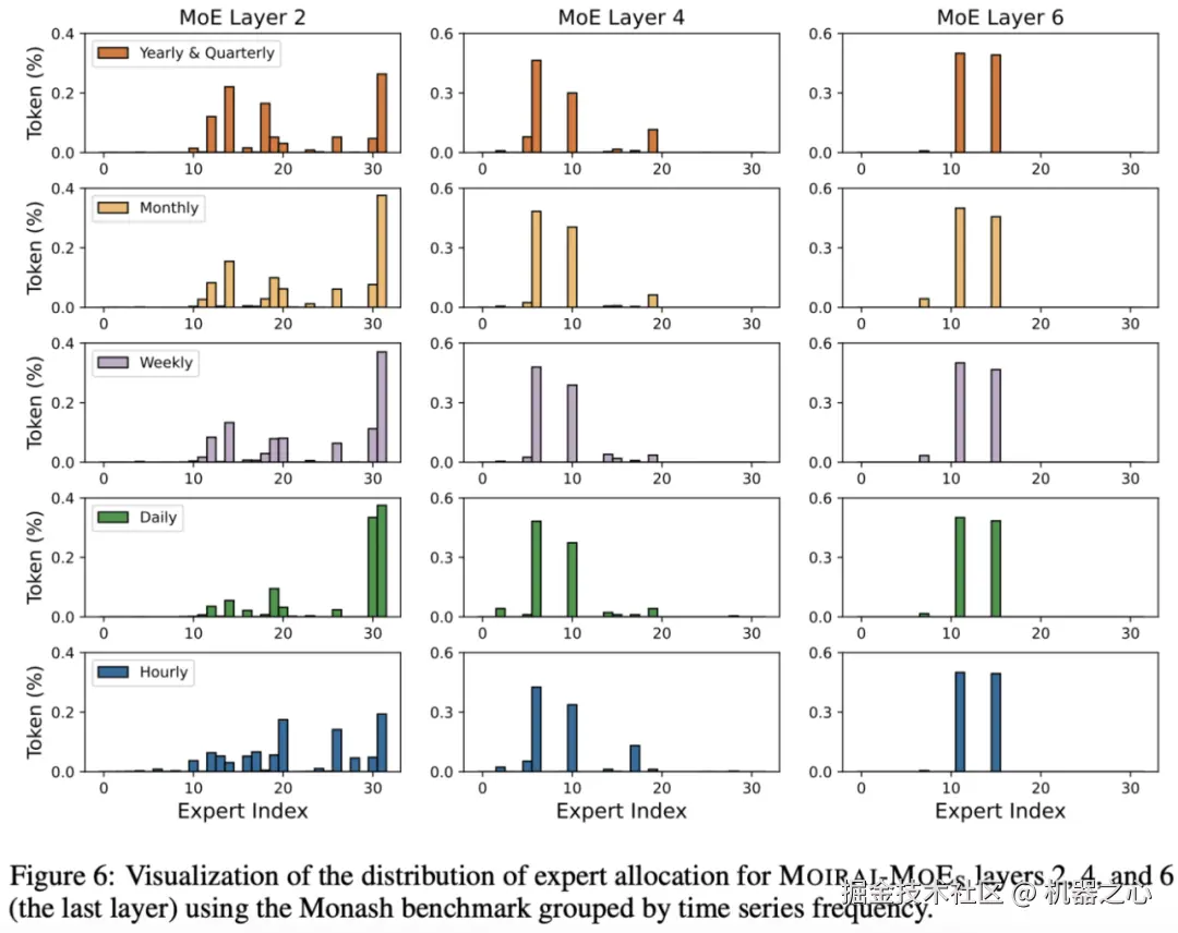 在浅层中,不同频率的数据在专家选择的分布上呈现多样化。随着层数的加深,模型将重点转移到更通用的时间依赖性,例如更广泛的趋势和长期模式,这些依赖性可以在不同频率之间共享。到最后一层(第 6 层),专家分配在所有频率上变得几乎相同,表明模型已将时间序列抽象为与频率基本无关的高级表示。这一证据表明 Moirai-MoE 学习到了频率不变的隐层表示,这对于模型泛化至关重要。