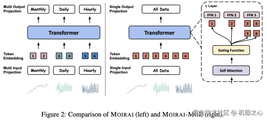Moirai-MoE 构建在它的前序工作 Moirai 之上。虽然 Moirai-MoE 继承了 Moirai 的许多优点,但其主要改进在于:Moirai-MoE 不使用多个启发式定义的输入 / 输出投影层来对具有不同频率的时间序列进行建模,而是使用单个输入 / 输出投影层,同时将捕获不同时间序列模式的任务委托给 Transformer 中的稀疏混合专家。此外,Moirai-MoE 提出了一种新型的利用预训练模型中知识的门控函数,并采用自回归的训练目标来提高训练效率。下面简要介绍 Moirai-MoE 的模块。